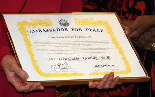 The Universal Peace Federation acknowledges as Ambassador for Peace those individuals whose lives exemplify the ideal of living for the sake of others, and who dedicate themselves to practices which promote universal moral values, strong family life, interreligious cooperation, international harmony, renewal of the United Nations, a responsible public media, and a establishment of a culture of peace.
